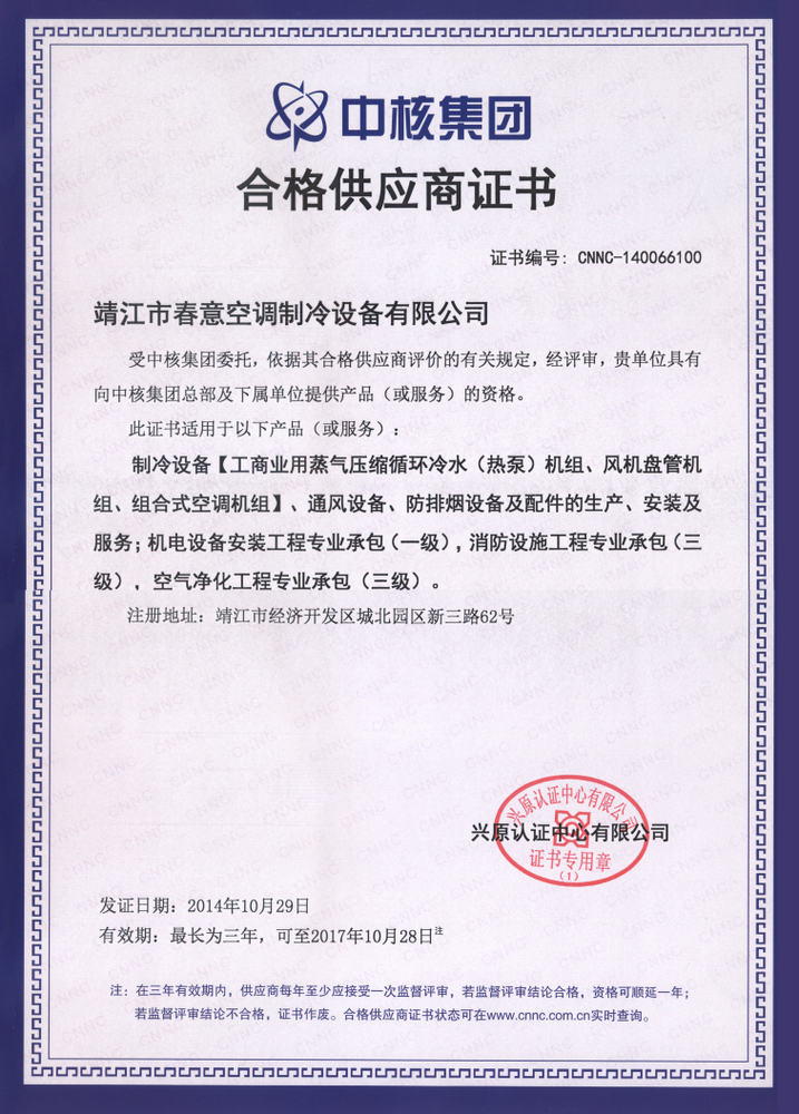 最近,我公司顺利通过中国核工业集团公司合格供应商评价专家委员会审定,获得中核集团合格供应商证书。